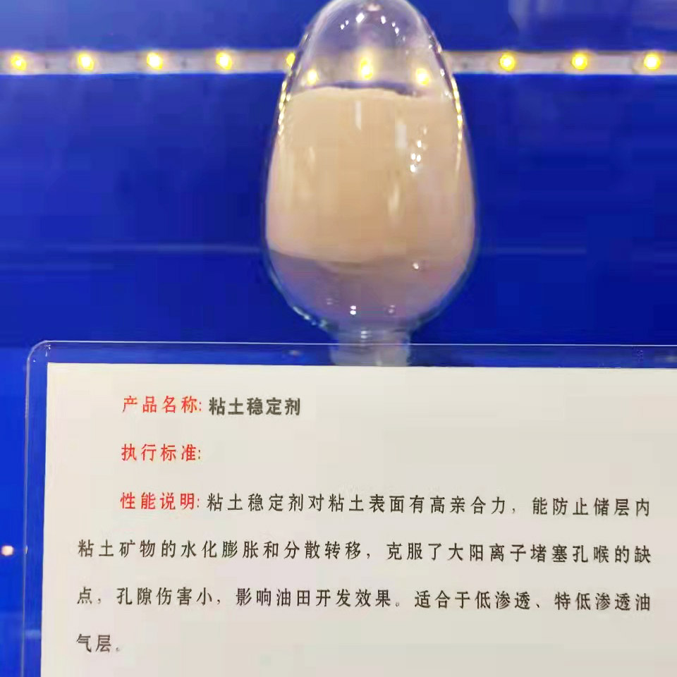 性能说明:粘土稳定剂对粘土表面有高亲合力,能防止储层内粘土矿物的水化膨胀和分散转移,克服了大阳离子堵塞孔喉的缺点,孔隙伤害小,影响油田开发效果。适合于低渗透、特低渗透油气层。